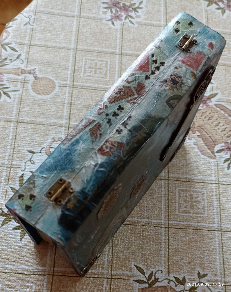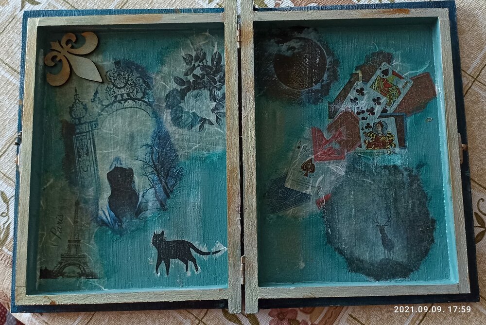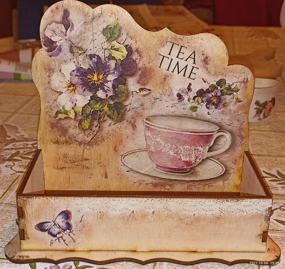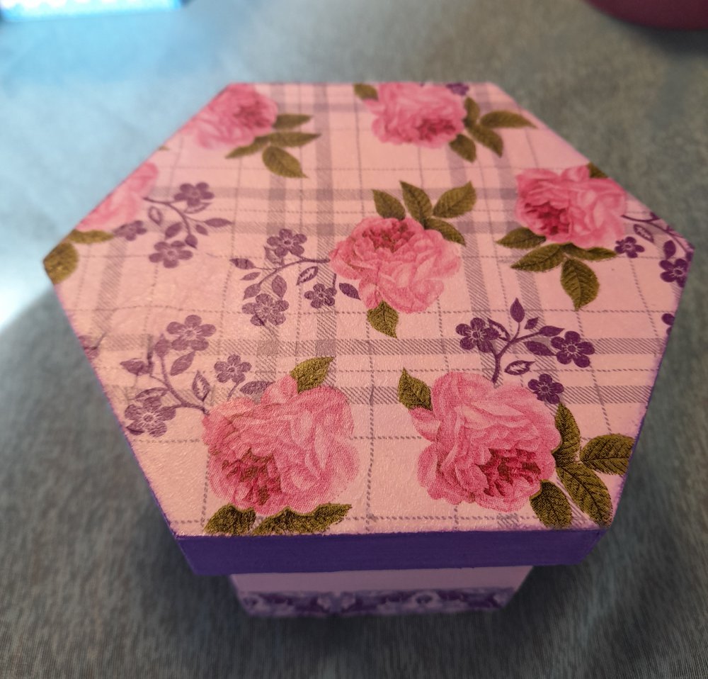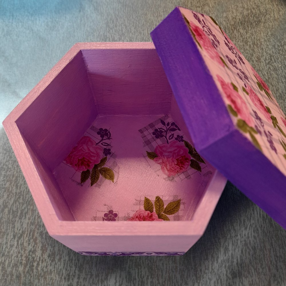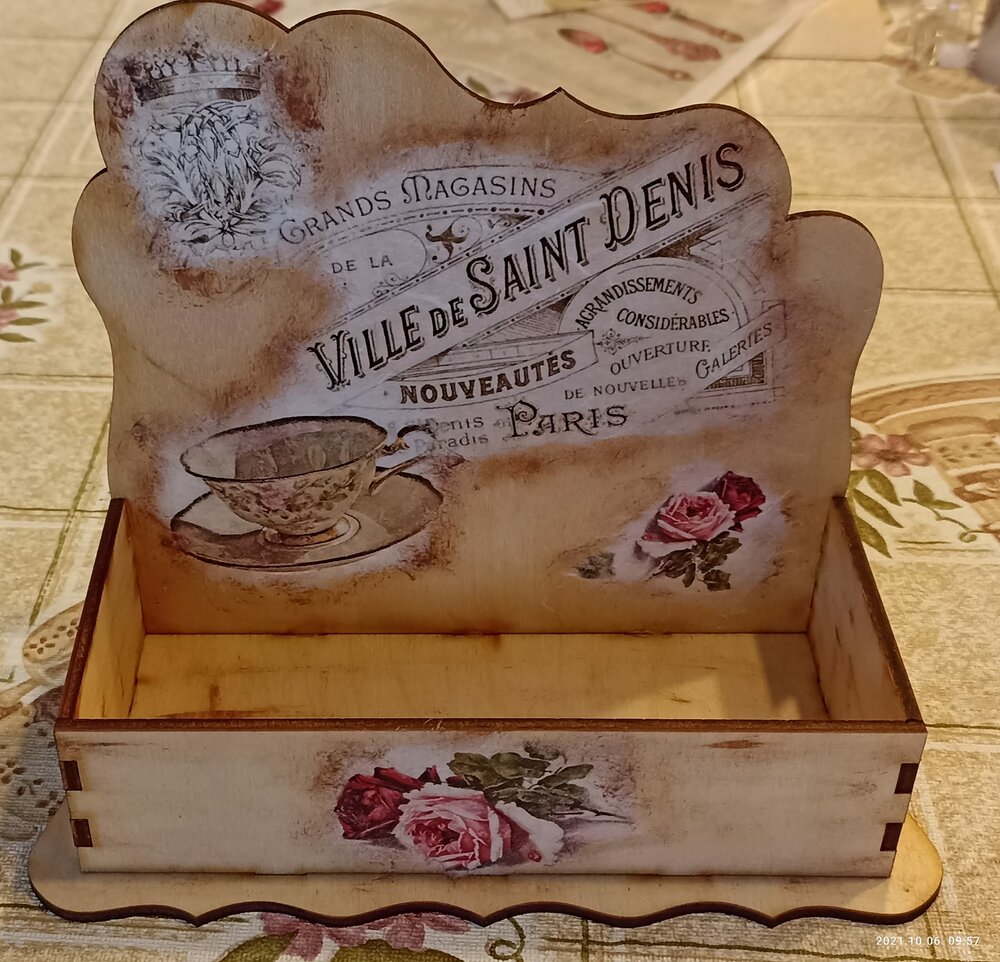 Krétafestékkel festettem, selyemfényű lakkal zártam, szalvétatechnikával díszítettem.
