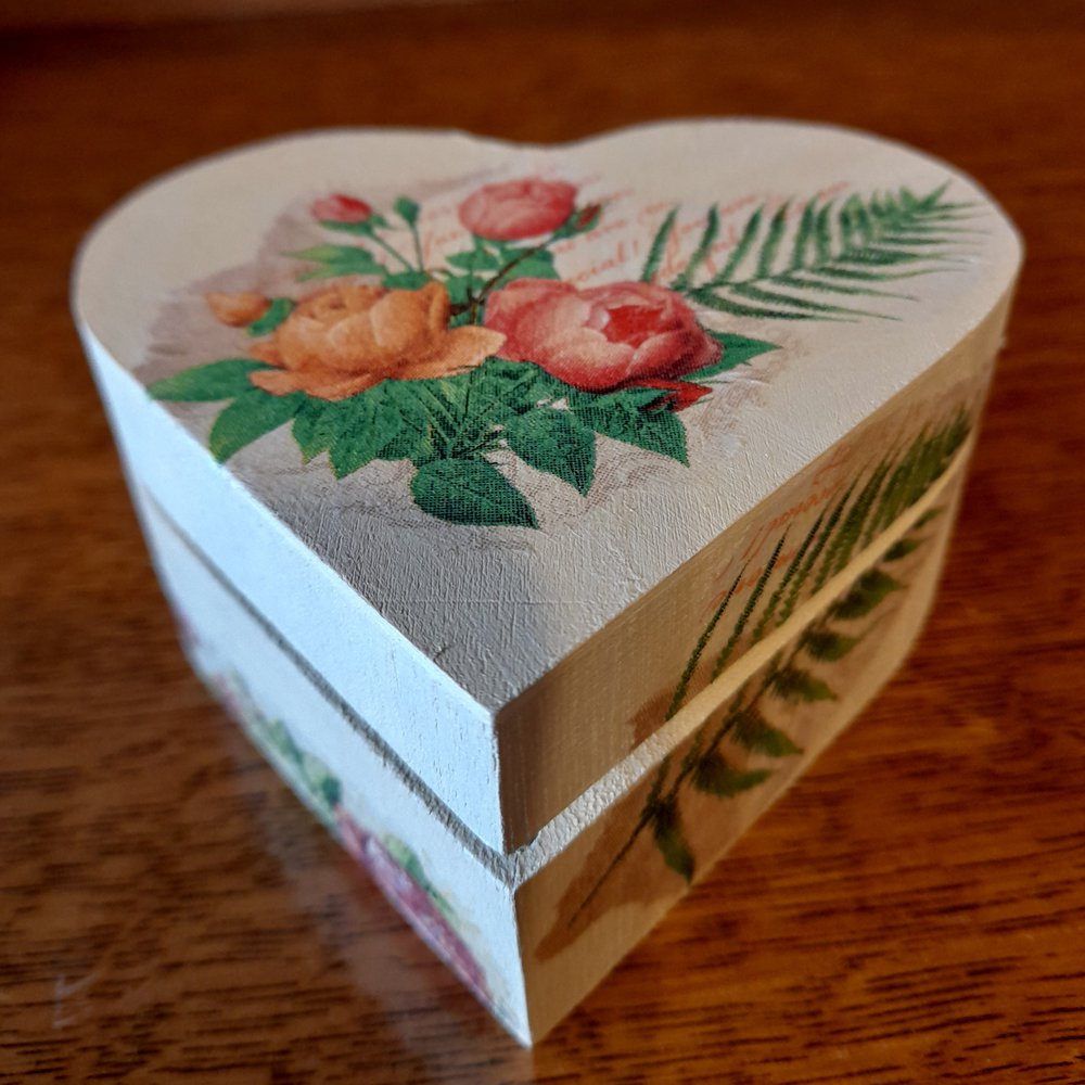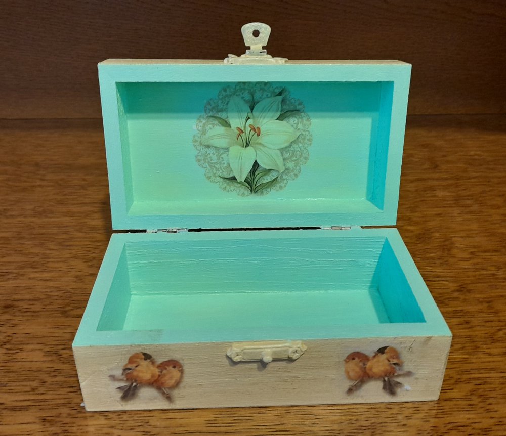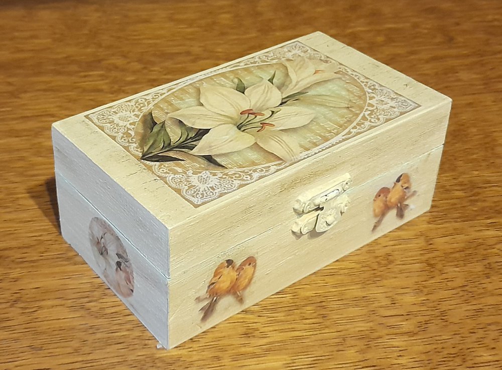 Egy egyszerű, mégis romantikus hangulatú virágos-madaras ékszerdoboz azok számára, akik nem annyira a habos-babos rózsaszínre vágynak.