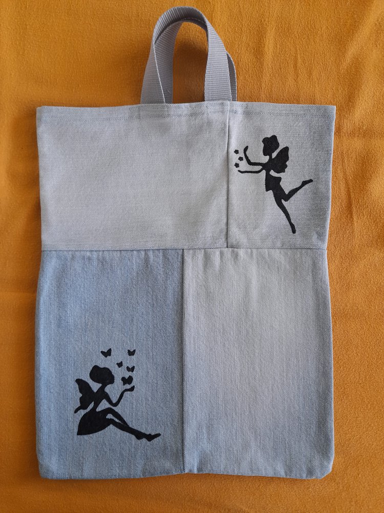 Újrahasznosított farmerből készült, kézzel festett táska.